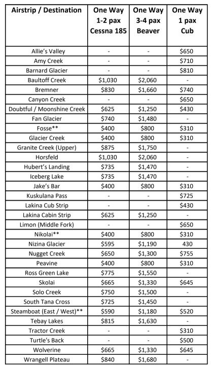 To figure the final cost, add the price of the drop-off location with that of the pick-up spot. Be sure to consider your passenger numbers and the weight of gear to determine which aircraft is appropriate. Typically the weight/freight capacities are 850 pounds for the Cessna 185, 1100 pounds for the Beaver, and 260 pounds for the cub. Note that weather conditions may decrease load carrying capacity and require an additional airplane.